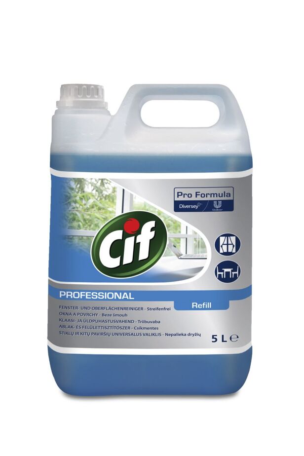 Properties: Cif Professional window and surface cleaner removes dirt quickly and effectively and provides a stripless, shiny surface and long-lasting fresh scent with patented ONT odor warming technology. Effective against greasy dirt and fingerprints. Can be used on windows, mirrors and other indoor waterproof surfaces, including tables and counters. Capacity: 5 l