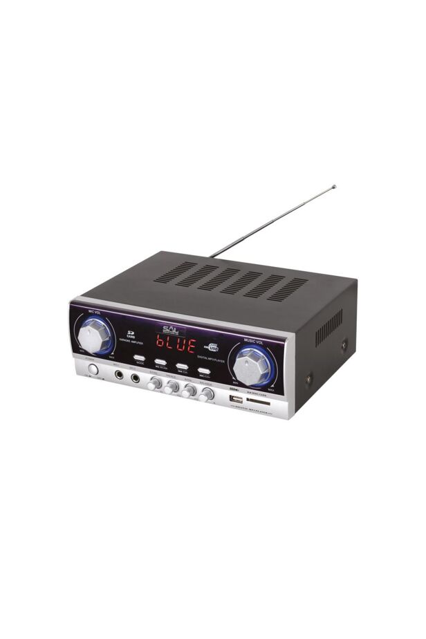 Features: Use the BTA 240 Multimedia Amplifier to enhance the optimal sound of your speakers and expand your adjustment options. It requires two external speakers to function, for which we recommend the SAL 2810SX 2-way handset. The device can be connected to both a mobile phone and a computer with a wireless BT connection. And if you want to listen to the radio, you can tune in the channels with automatic tuning. The amplifier also provides MP3 / WMA playback from a USB / SD device. You can choose from a number of settings: repeat selected or all songs, treble and bass and EQ sound effects, adjustable microphone echo effect, separately adjustable microphone volume, dual volume control with level limitation. Not only with USB input, but also with 2x KARAOKE microphone input (6.3 mm) and 2x RCA stereo audio input (LINE IN). The Multimedia Amplifier is supplied with a 1 m long power cord and a remote control. Wireless BT connection Listen to music from mobile device, computer MP3 / WMA playback from USB / SD device Repeat selected or all songs EQ music style tone effects FM radio with auto tuning Treble and bass, balance control 2x KARAOKE microphone input (6.3mm) Adjustable microphone echo effect Separately adjustable microphone volume 2x RCA stereo audio input (LINE IN) Dual volume control with level limitation Dynamic Hi-Fi sound, classic transistor amplifier Remote control power supply: 2xAAA (1.5V) battery, not included Power supply: 230V / 50Hz mains connection cable Dimensions and weight: 260 x 100 x 220 mm / 2.3 kg Requires two external loudspeakers, recommended type: 2x SAL 2810SX Scratched surfaces!